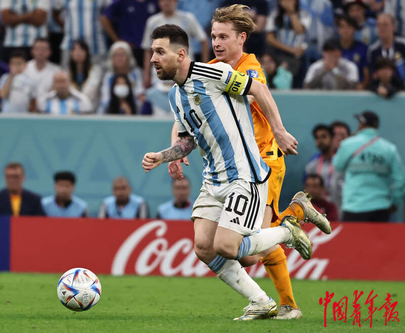 12月10日,卡塔尔卢塞尔球场,2022卡塔尔世界杯1/4决赛阿根廷对阵荷兰的比赛中,阿根廷队梅西(前)在场上带球。刘占崑/摄