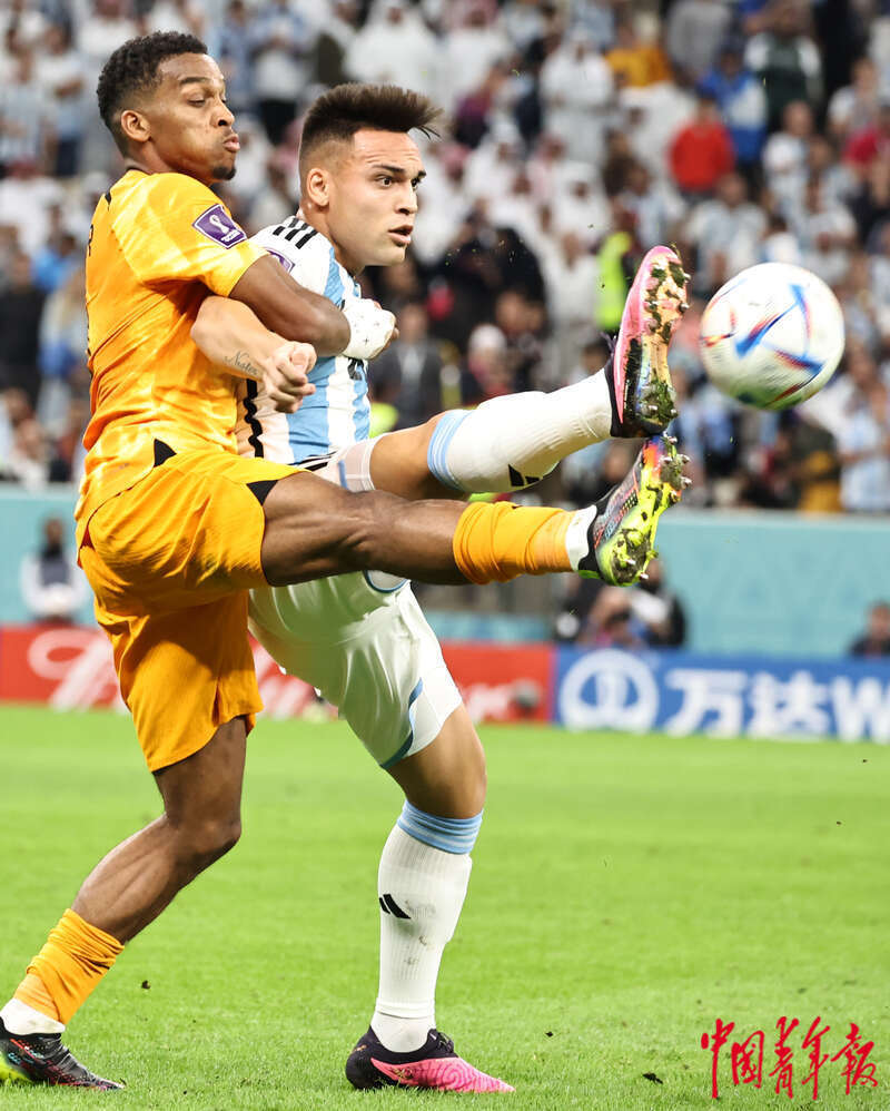 12月10日,卡塔尔卢塞尔球场,2022卡塔尔世界杯1/4决赛阿根廷对阵荷兰的比赛中,荷兰队廷贝尔(左)与阿根廷队劳塔罗争球。刘占崑/摄