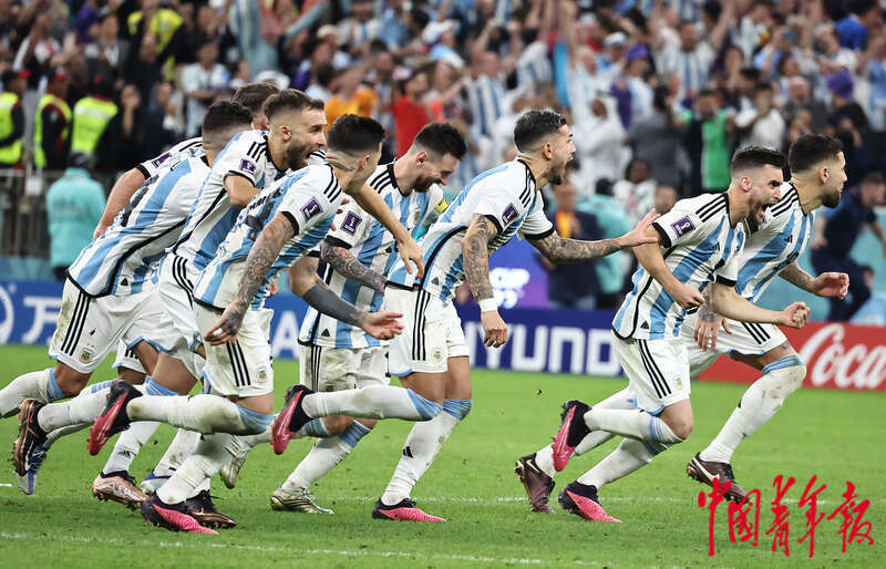 12月10日,卡塔尔卢塞尔球场,2022卡塔尔世界杯1/4决赛阿根廷对阵荷兰的比赛中,阿根廷队点球大战胜利瞬间,球员们集体狂奔庆祝。刘占崑/摄