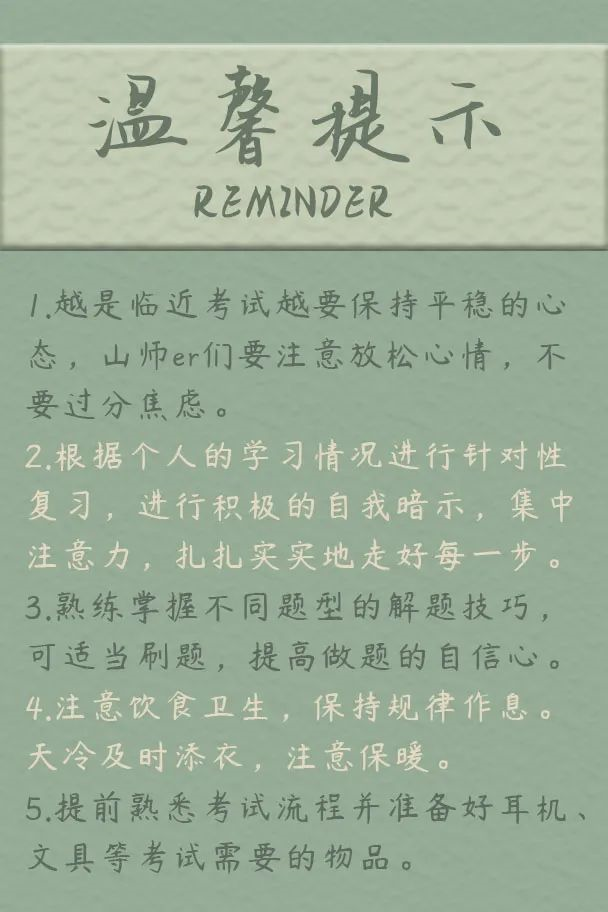 其次是细心,答题卡选择题不要涂错,交卷之前再核对一遍。作文的卷面分也很重要,作文的字迹要尽量工整,保证卷面整洁。