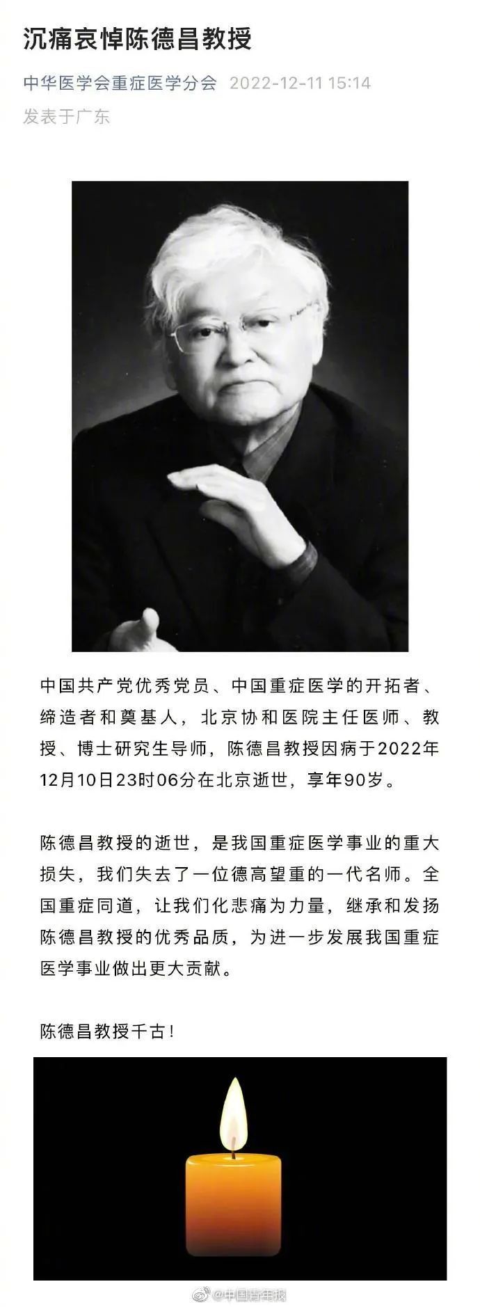 据中华医学会重症医学分会消息,中国共产党优秀党员、中国重症医学的开拓者、缔造者和奠基人,北京协和医院主任医师、教授、博士研究生导师陈德昌教授因病于2022年12月10日23时06分在北京逝世,享年90岁。