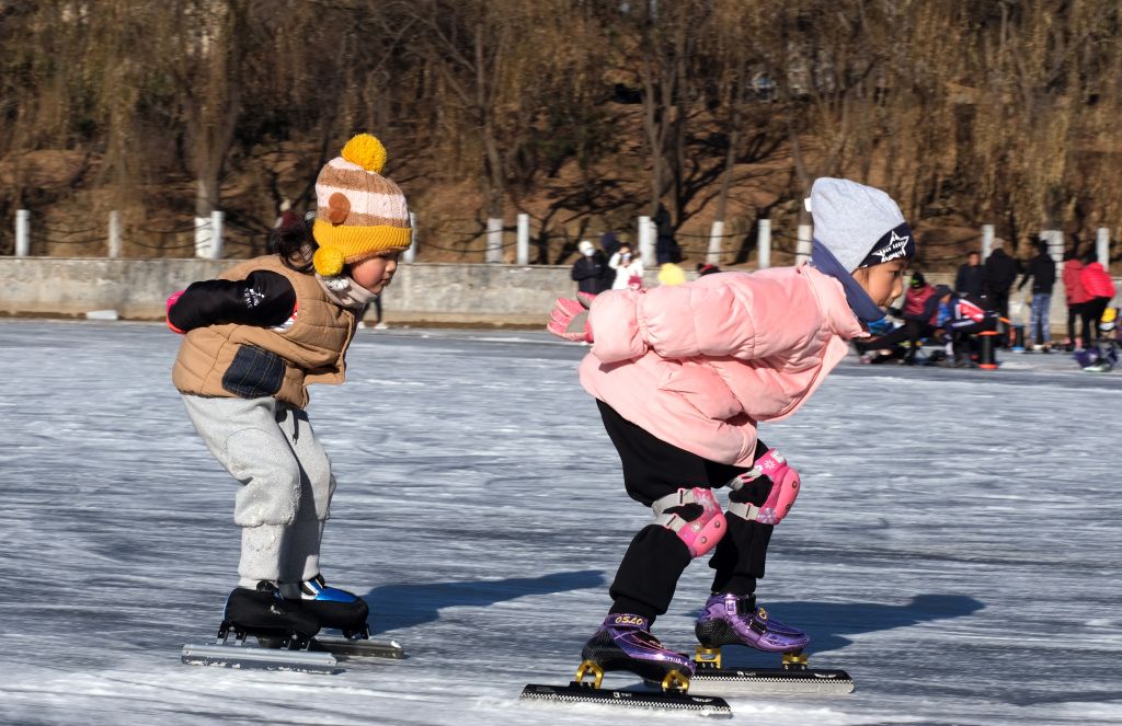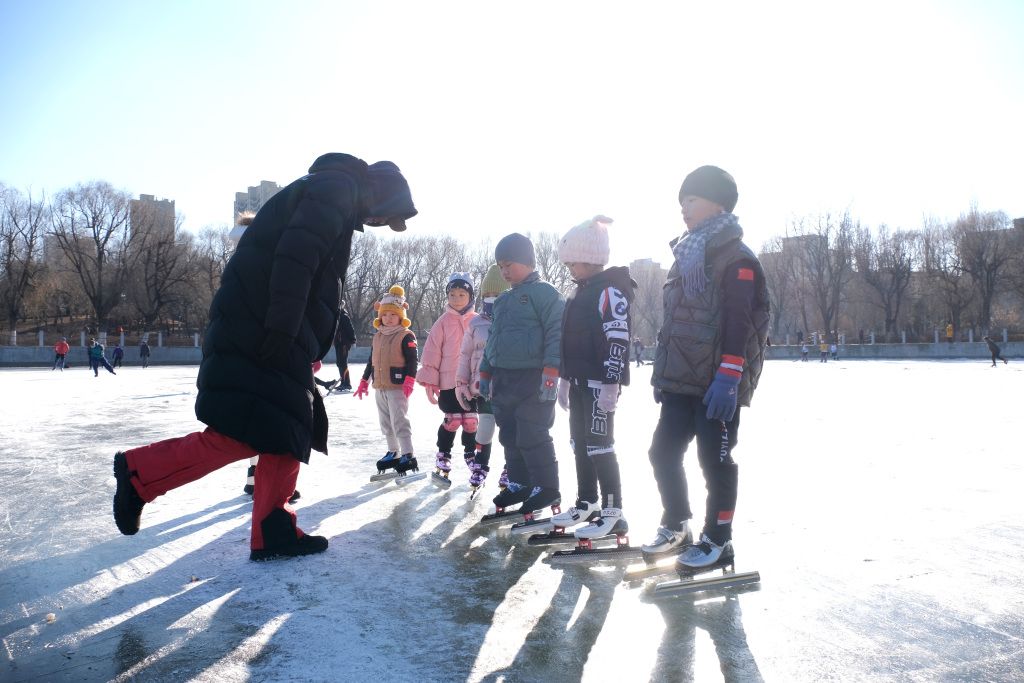 2022年12月11日,沈阳,在劳动公园冰场,小朋友在练习滑冰。