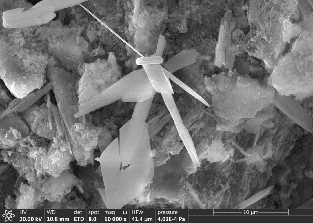 此图为全固废充填材料在场发射扫描电镜下放大10000倍的微观形貌,捕捉了片状氢氧钙石堆叠后形成的聚集形态。周围的凝胶镶嵌在结构表面,形状类似飞行器。我认为,每一位优秀的科研工作者都有一段沉默的时光,那段时光,是付出了很多努力,却得不到结果的日子,我们把它叫做扎根。科研长路漫漫,只有不断沉淀,才能展翅飞翔!