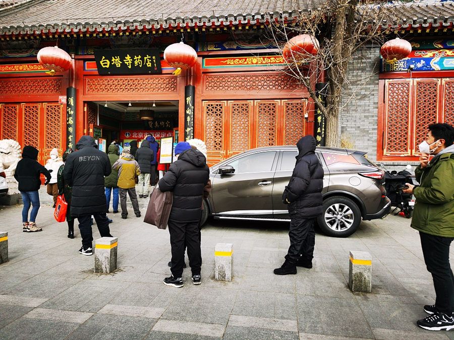 2022年12月12日,北京,市民在白塔寺药店门前排队购买感冒类药品。