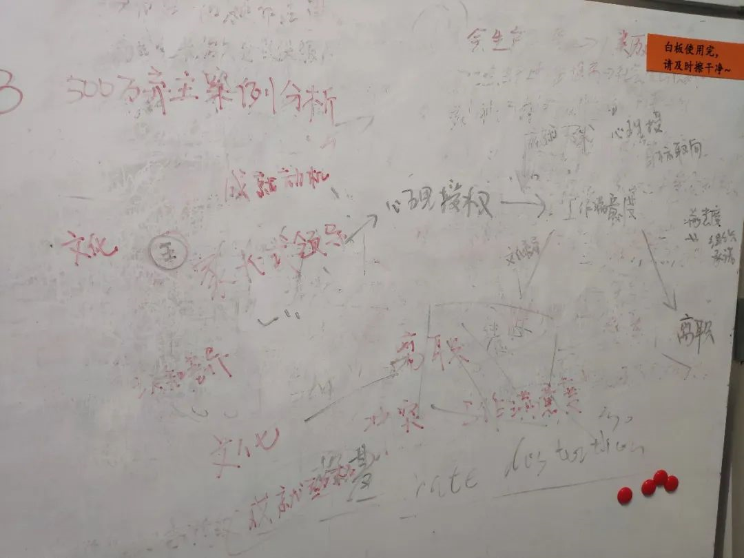 图书馆讨论室的白板上,记录着陈春吉组织行为学小组作业讨论的过程