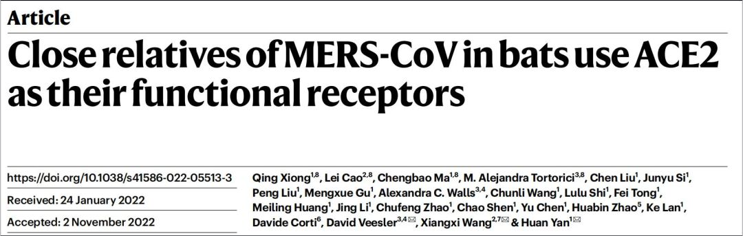 2022年12月07日,Nature (《自然》)期刊以长文 (Article) 形式在线发表了我校病毒学国家重点实验室/生命科学学院严欢研究组在病毒受体领域的最新研究成果,论文题为“Close relatives of MERS-CoV in bats use ACE2 as their functional receptors”(《MERS冠状病毒在蝙蝠中的近亲病毒使用ACE2作为它们的功能性受体》)。
