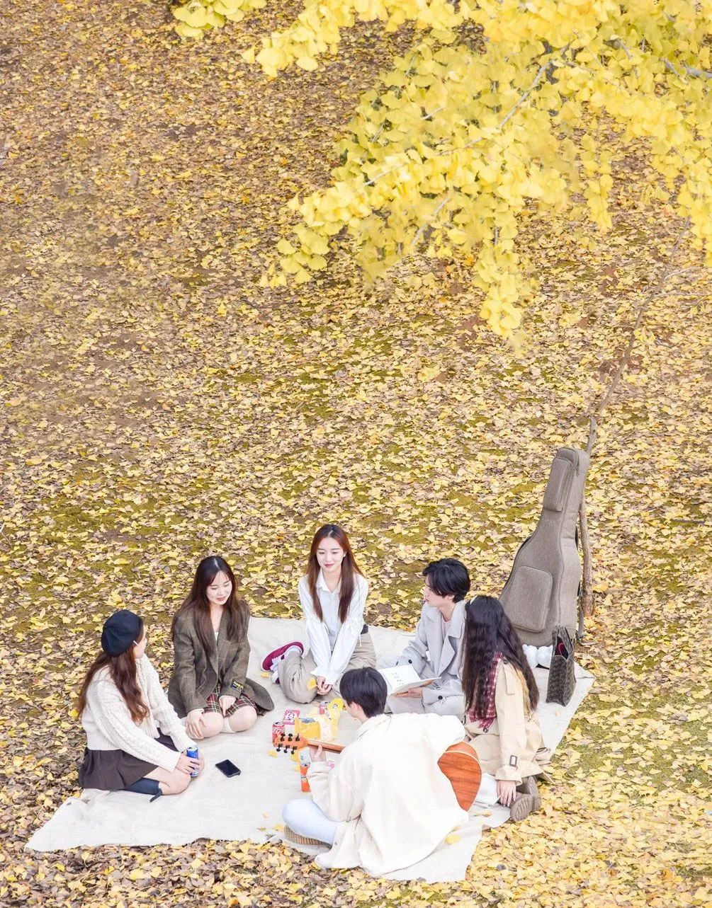 三五好友围坐于金黄的银杏海洋中