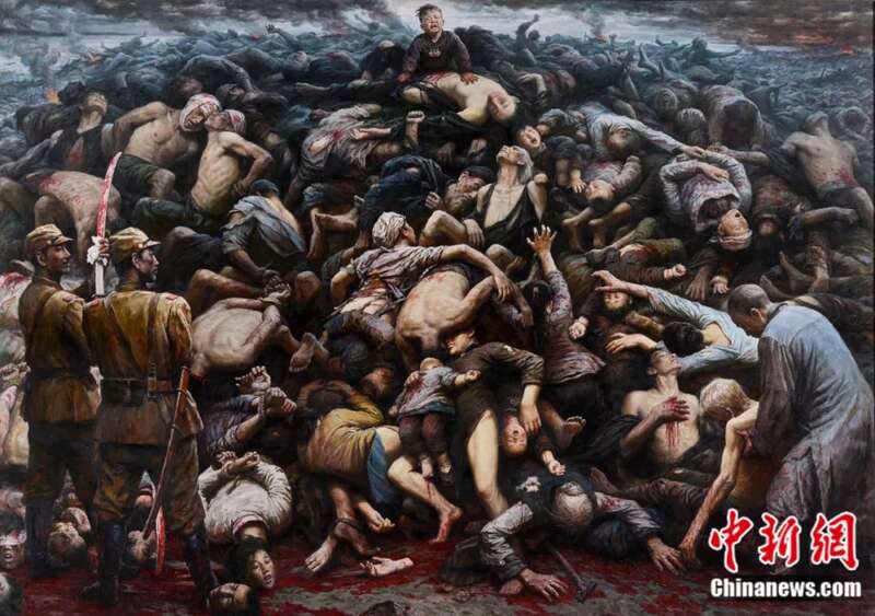 李自健近日接受中新社“东西问”专访时表示,希望用这张有强烈视觉感官的油画,让观者“牢记历史,勿忘国耻”。