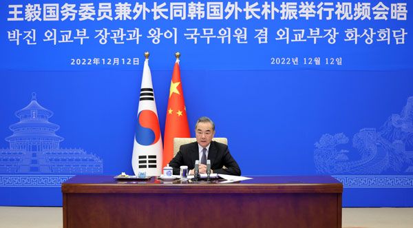 2022年12月12日,中共中央政治局委员、国务委员兼外长王毅同韩国外长朴振举行视频会晤。