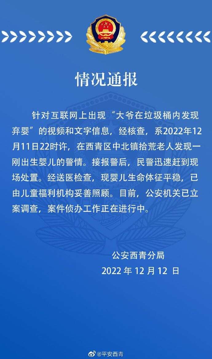 针对互联网上出现“大爷在垃圾桶内发现弃婴”的视频和文字信息,经核查,系2022年12月11日22时许,在西青区中北镇拾荒老人发现一刚出生婴儿的警情。接报警后,民警迅速赶到现场处置。经送医检查,现婴儿生命体征平稳,已由儿童福利机构妥善照顾。目前,公安机关已立案调查,案件侦办工作正在进行中。