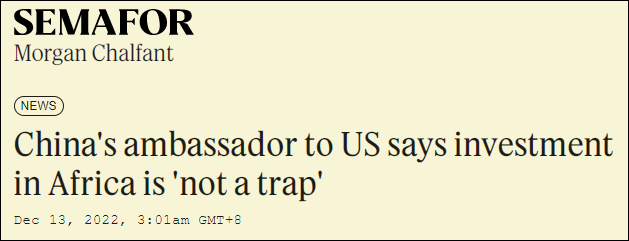12日,美国商业新媒体Semafor也举办了一场“非洲论坛”,邀请众多政商界人士,中国驻美国大使秦刚也受邀出席。期间,在回应西方所谓“中国投资非洲是债务陷阱”的问题时,秦刚当场予以驳斥。他指出,中国对非洲的投资援助是实实在在的好处,他同时援引一份报告称,西方让非洲所背负的债务实际上更为沉重。