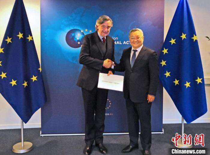 中国驻欧盟使团新任团长傅聪向欧盟对外行动署礼宾负责人贝切特递交国书副本。 中国驻欧盟使团供图