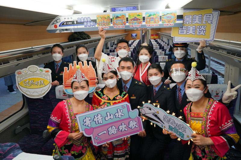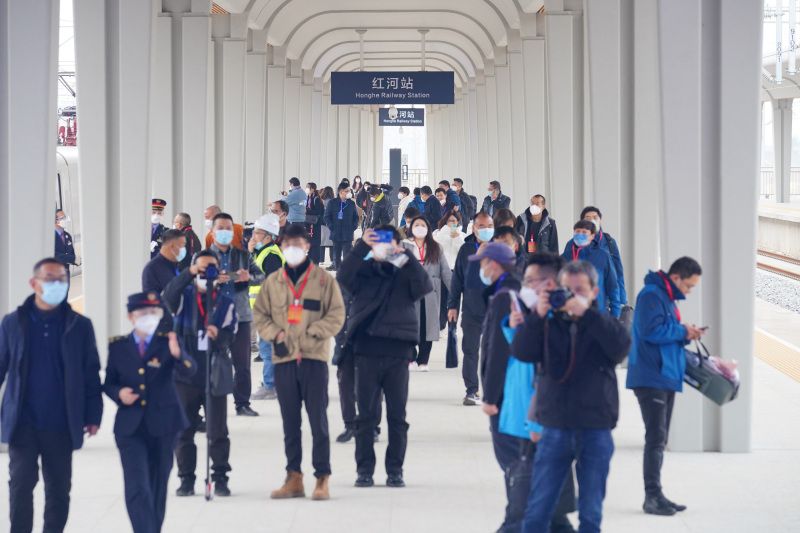 2022年12月14日,云南红河,弥(勒)蒙(自)高铁开展试乘体验,预示着这条铁路开通在即。弥蒙高铁位于云南省红河哈尼族彝族自治州境内,是全国首条少数民族自治州城际高铁,北起南(宁)昆(明)客运专线弥勒站,向南途经弥勒市、开远市,止于红河州州府蒙自市,正线长约107公里,设计开行旅客列车时速目标值为250公里。开通运营后,游客就可以早上在昆明滇池边喂红嘴鸥,下午来到蒙自市品尝正宗过桥米线。 中新社记者 刘冉阳 摄