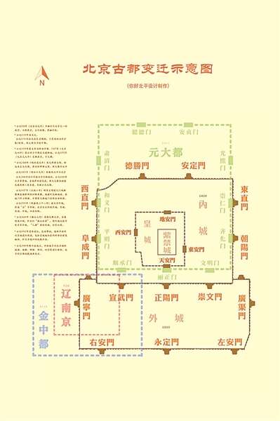 “这是北京都城变迁的示意图,这部分内容一直都是北京历史讲座中的重点与难点,整个过程很难理解且不易想象,于是我就设计了这幅插图,从辽南京到金中都,从元大都到明清北京城,再配上重点标注与文字说明,千年古都的衍化历史便一下清晰直观起来。”这几幅图都是夏凡自己设计,“这种图形设计的技能在北京文史讲师中并不多见,找不到合适的图,我就自己动手直接画。”各种插图、示意图、建筑立面图、平面图……这些根据史料文献并融入了自己思考的制图,相当于一种新生的研究成果。夏凡感触很深,“制图的过程是充满乐趣的,当一张图设计完成后,当大家看着你的图茅塞顿开后,那份成就感也是无与伦比的……当然每站课程的图册也是会不断补充的,比如今天讲到一个问题,发现大家可能没听懂,于是回去就会重新设计一张插图补充进来,这样图册就会越来越完善。”