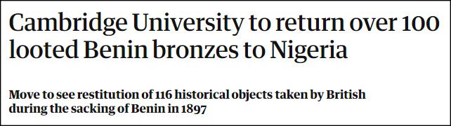 剑桥大学的一名发言人说:“慈善委员会已经考虑并批准将116件文物,通常被称为贝宁青铜器(Benin bronzes),由剑桥大学考古和人类学博物馆归还给尼日利亚国家博物馆和纪念碑委员会。校方正在与委员会合作,确定后续步骤,我们将在适当的时侯进行沟通。”
