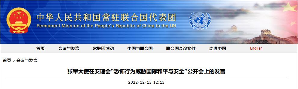 据中国常驻联合国代表团网站12月15日消息,张军大使在安理会“恐怖行为威胁国际和平与安全”公开会上发言。