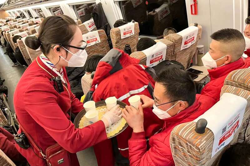 在G58次列车上,列车长胡怡文听闻快递小哥们乘坐本趟列车进京,便安排乘务员第一时间为他们送上热水。