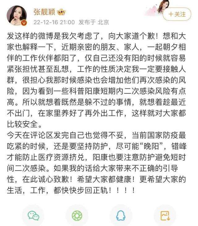 12月16日下午3时许,歌手张靓颖在自己账号上分享自己感染新冠病毒的经历,因为她在分享的时候,提到自己主动感染病毒,并且在感染后非但没有不舒服,反而还皮肤变好,引发网友热议。晚9时,张靓颖删文并道歉,相关话题冲上热搜第一。