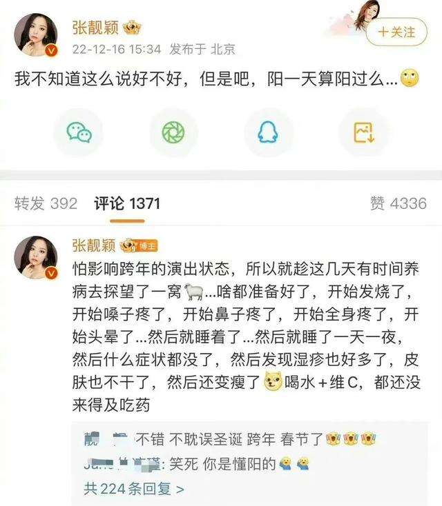 随后张靓颖在评论区里分享了自己这次感染的经历,张靓颖说自己主要是怕影响半个月后的跨年演出,于是趁着自己这段时间有空,就主动去了一大群阳性病号人群中“蹭病毒”,然后张靓颖也已经做好了万全的准备。