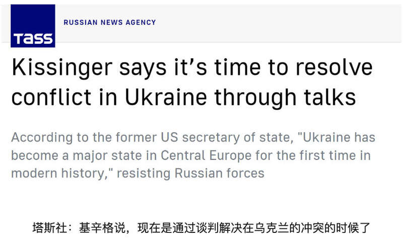 “基辛格说,现在是通过谈判解决在乌克兰的冲突的时候了”。塔斯社以此为题报道称,美国前国务卿亨利·基辛格在17日刊发的一篇文章中表示,世界可能正处于俄乌冲突的转折点,他呼吁通过谈判实现和平。
