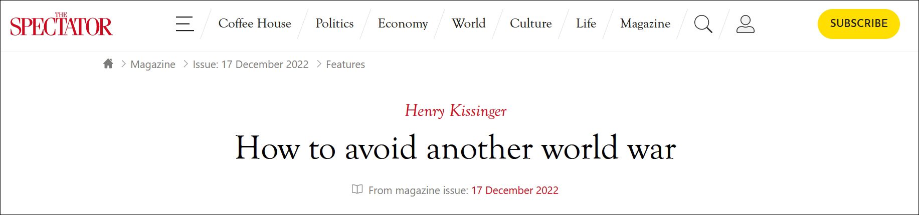 基辛格在文中表示,随着冬季到来,俄乌战事明显放缓,如今的世界似乎正处在类似于1916年8月一战时期的转折点。当时,历经两年鏖战两年和数百万人伤亡,各个主要参战国开始探索休战的前景。由于付出代价过于惨痛,又不愿意给人留下软弱的印象,各国领导人对于正式启动和平进程犹豫不决,最终寻求美国的调解。
