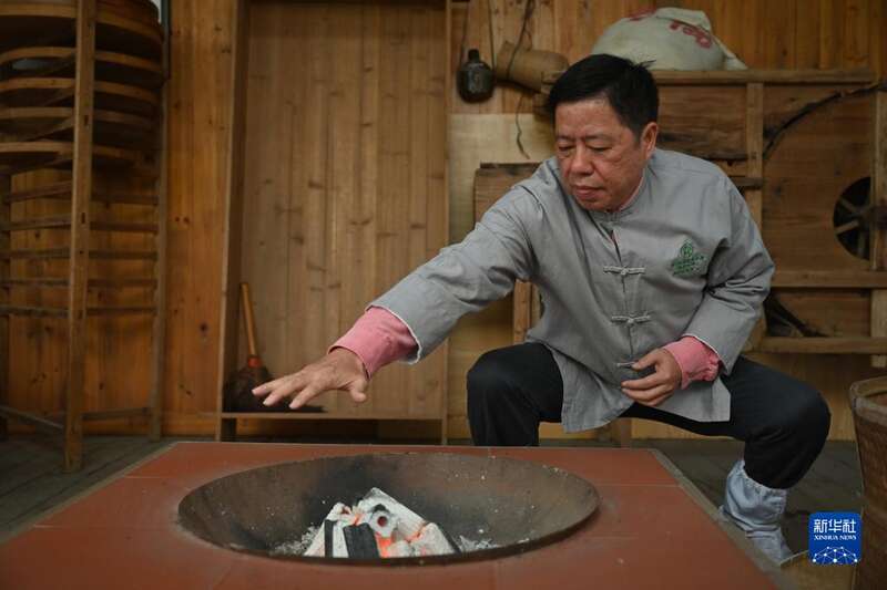 12月16日,在福州茉莉花茶制茶工坊,福州茉莉花茶传统窨制工艺大师傅天甫在进行第五道工序“烘”之前感受火的温度。