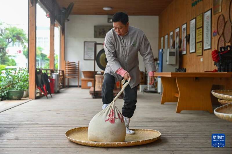 12月16日,在福州茉莉花茶制茶工坊,福州茉莉花茶传统窨制工艺大师傅天甫进行制茶的第三道工序“蹚”。“蹚”是将经过“平”“抖”工艺分出的茶叶装入布袋,用脚来回斜度蹚下,改变茶叶的大小、长度。