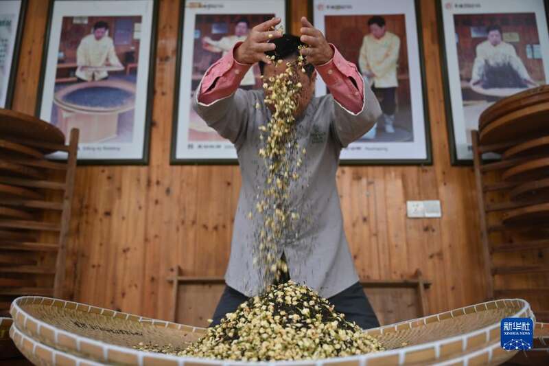 12月16日,在福州茉莉花茶制茶工坊,福州茉莉花茶传统窨制工艺大师傅天甫进行制茶的第六道工序“窨”。