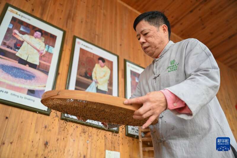 12月16日,在福州茉莉花茶制茶工坊,福州茉莉花茶传统窨制工艺大师傅天甫进行制茶的第四道工序“拜”。“拜”是用竹制拜箕上下拜拨,分离掉细碎茶叶。