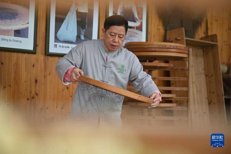 12月16日,在福州茉莉花茶制茶工坊,福州茉莉花茶传统窨制工艺大师傅天甫进行制茶的第一道工序“平”。“平”就是用多孔竹制品筛茶,将毛茶分出大小、粗细。