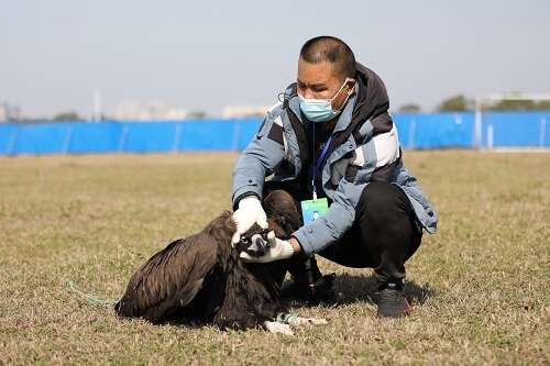 唐文利戴上手套等防护设备,拿着刀子小心翼翼地走到被网缠住的秃鹫身边。秃鹫的警惕性非常高,多次试图伸长脖子啄他。经过他一番安抚后,秃鹫慢慢放松戒备。他和赶到现场的观鸟爱好者一起按住秃鹫的脑袋,然后用刀割断球网,将它解救下来。随后,北海市林业局工作人员和唐文利一起,将秃鹫送往北海市野生动物救助点——北海市瑞派爱诺宠物医院进行救助。