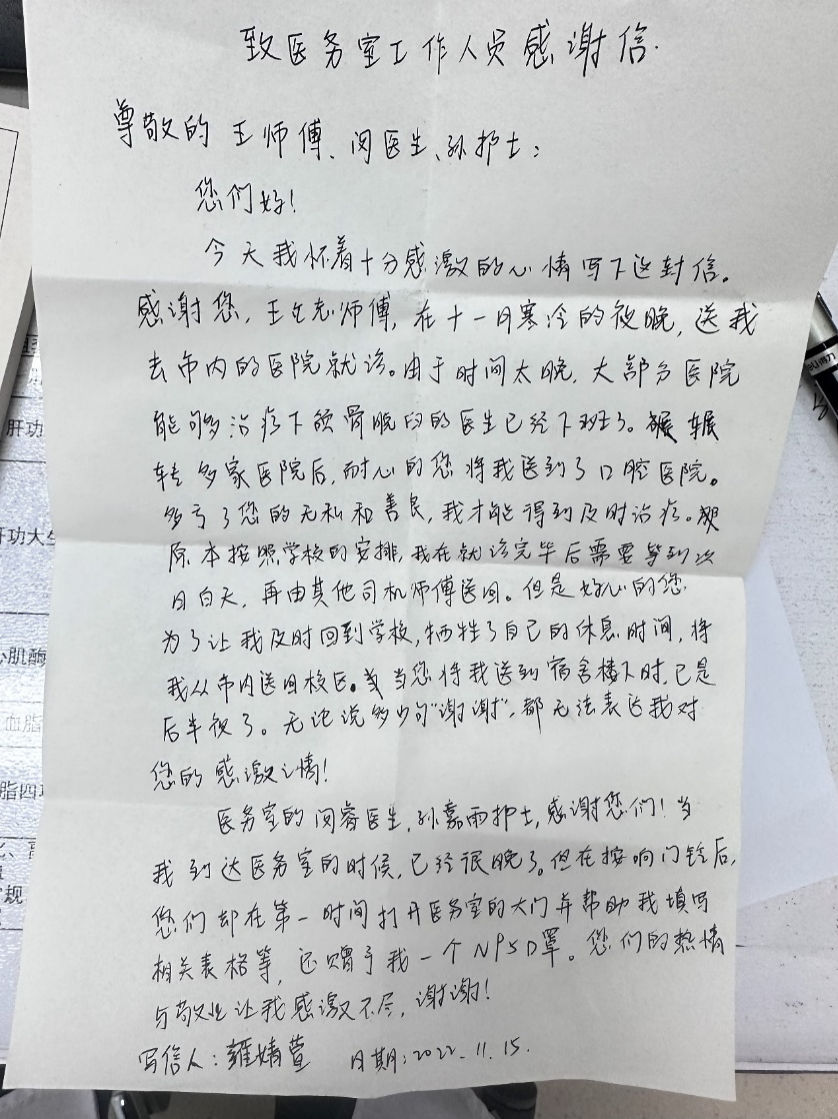 东北大学校医院收到了这样一封温暖人心的感谢信