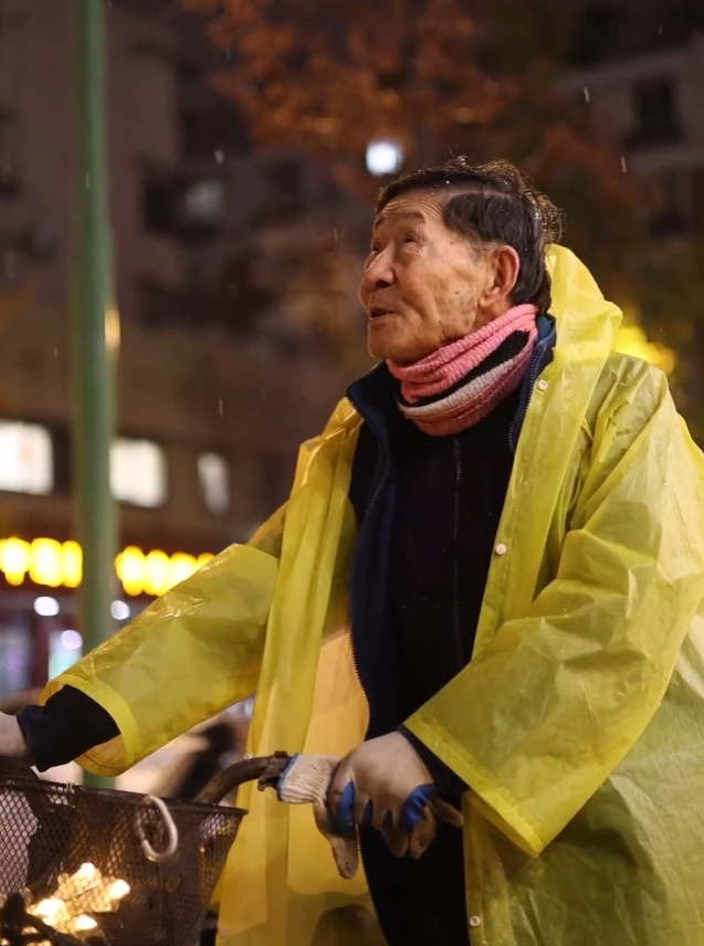 雪夜里,老人吃力地推着三轮车