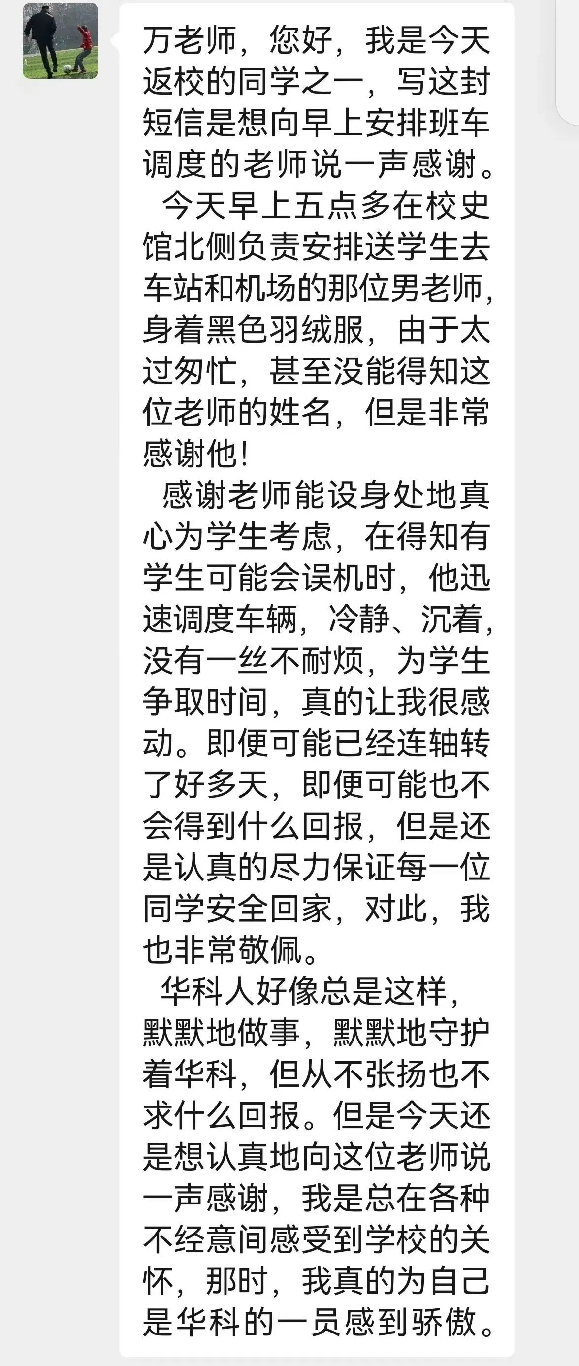 这位同学口中“穿黑色羽绒服的老师”是总务后勤处学术交流服务中心运输部副经理王黎。12月16日早上5:30,前往天河机场的同学人数超过预期,上车速度缓慢。一名同学拎着行李箱慌慌张张地跑来找到王黎,“怎么办,我们快赶不上飞机了!”王黎立刻找到车队经理万定华商量,紧急调动备用小客车更换线路,提前出发,送几位需要赶飞机的同学先去机场,帮助同学们顺利踏上了回家的旅途。