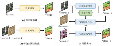 为了解决传统思路扩展面临病态缺陷的问题,景俊鹏提出了一种多步骤、多节点灵活处理的思路,将传统单步骤处理的病态问题转换为多步骤的适定问题,动态化、模块化组装网络。 这些研究在一定程度上分别 推进了对图像隐藏领域核心的质量和容量问题的研究 。