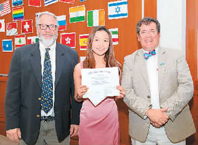 赵储珺(中)高中获奖时和老师合影。