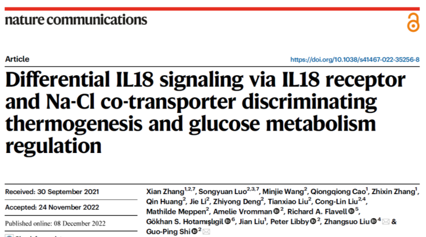 食品与生物工程学院刘健教授团队青年教师、“黄山学者”学术骨干张弦副教授(第一作者),和哈佛大学医学院Guo-Ping Shi教授等合作,以合肥工业大学为第一单位,在Nature Communications在线发表了题为“Differential IL18 signaling via IL18 receptor and Na-Cl co-transporter discriminating thermogenesis and glucose metabolism regulation”的研究。该研究报道了,IL18作为棕色脂肪因子,通过NCC促进BAT产热和线粒体功能,通过IL18r增加WAT胰岛素敏感性和葡萄糖代谢,进而改善肥胖和胰岛素抵抗的作用机制。