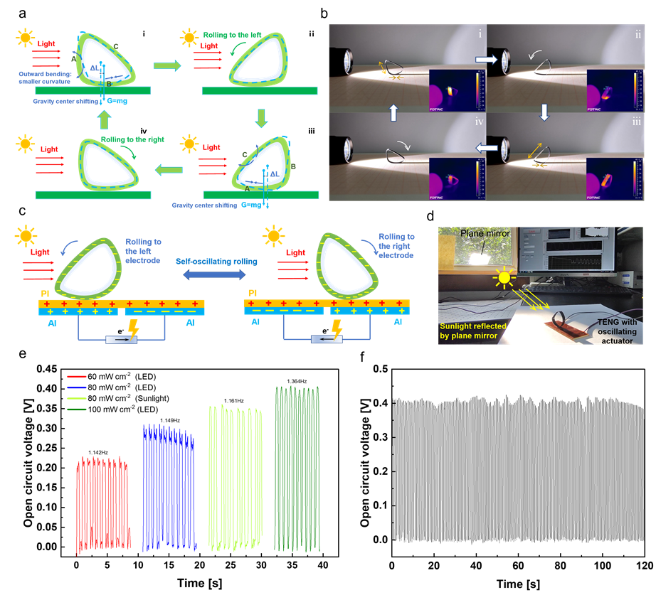 图2:CNT-Nafion/PE构建的光照下可持续自振荡软体机器人、摩擦纳米发电机以及将太阳能转换为电能的光致发电装置