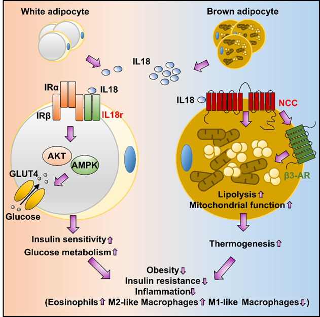 白介素18(IL18)是一个在肥胖和多种代谢疾病发生发展中起重要作用的多效细胞因子。此前的研究已发现,IL18可以在脂肪细胞等多种细胞中表达,通过受体IL18r和NCC协作介导发挥作用。然而,IL18是否可能作为脂肪细胞因子,通过这些受体调控脂肪细胞产热、胰岛素敏感性和葡萄糖代谢尚不清楚。
