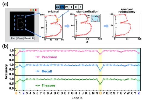 作为RNNs的核心模块门控循环单元(GRU)可将迭代乘法运算转化为累加运算,解决梯度爆炸或消失问题。然而,GRU模型的运算通常涉及大量的网络参数和迭代运算。使用传统的架构系统执行GRU模型需要大量的计算资源,而数据传输也限制了整体计算速度,在硬件实现上存在严重瓶颈。团队提出了一个基于忆阻器的GRU单元全电路。GRU电路作为循环神经网络工作的核心模块,具有充分的硬件实现和实际应用潜力。模拟实验显示电路模拟输出和软件模拟输出之间的平均误差相对较低,为1.07%,这说明该电路在GRU模型中显示出良好的兼容性。之后建立了一个八层GRU网络来处理手写字符序列检测任务,识别精度达到93%,预测任务精度达到92%。这表明所设计的GRU网络在处理时间序列数据时具有较好的性能。本工作扩展了基于忆阻器的神经形态计算系统在人工智能领域中的应用范围。