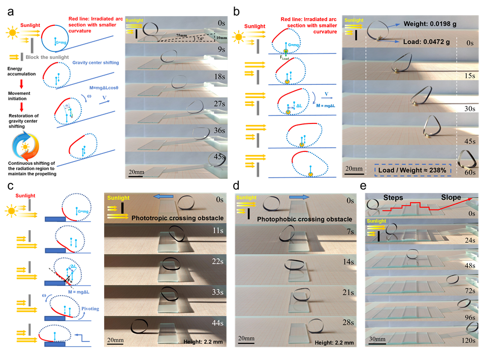 图1:在光照射下具有自持续运动的轮式软体机器人(趋光/背光运动及自适应负载、越障行为)