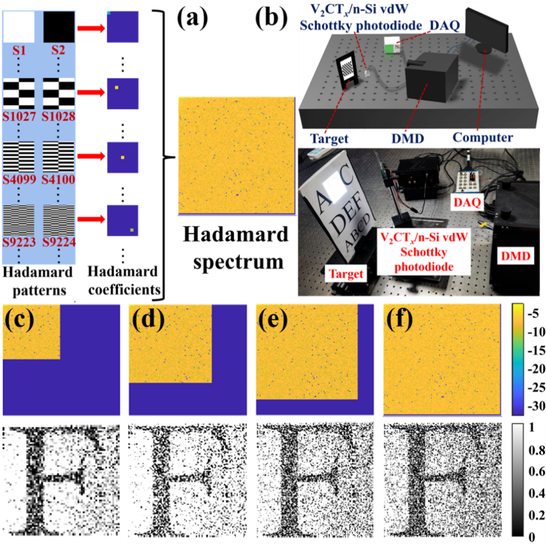 单像素成像 (SPI) 作为一种新颖的计算成像技术,因其在解决传统成像中的一些难题方面具有巨大潜力而受到越来越多的关注,在三维 (3D) 成像、超光谱成像和太赫兹成像等领域具有广阔的应用前景。Hadamard单像素成像 (HSI) 作为SPI技术的代表,由于其与高速数字微镜器件 (DMD) 的完美匹配,能够有效地提高SPI的数据采集速度和图像重构质量。对弱光条件的可靠响应是发挥HSI优势的必要前提,因此,人们尝试使用高势垒高度、低暗电流的光电二极管来满足这一条件。然而,传统的硅基肖特基势垒光电二极管在提高肖特基势垒高度时遇到了金属电极材料在肖特基接触界面扩散导致接触质量差的难题。近年来,二维过渡金属碳化物、氮化物或碳氮化物 (MXenes),由于其表面无悬挂键和功函数可调节的特性,已被有效应用于构建高势垒高度的肖特基势垒二极管结构。