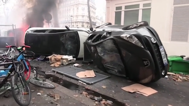 示威者焚烧的汽车 BBC视频截图