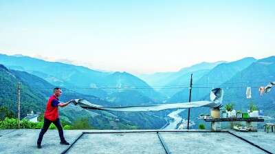 在云南怒江州泸水市鲁掌镇登梗村,公益电影放映员杨明金甩开幕布,为电影放映做准备。 新华社发