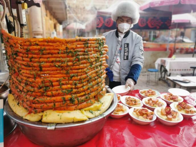夜幕降临,南疆喀什古城里,巷道交错,各式小彩灯温馨喜人。热气腾腾的面肺子、摆放整齐的烤羊蹄、香飘四溢的烤乳鸽……市民游客自觉佩戴口罩,保持社交距离的同时,享受着特色美食。