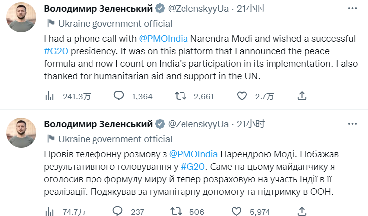 不过,据《印度斯坦时报》报道,印度的官方声明中并未提及泽连斯基的“和平方案”。此外,这是自去年10月以来,莫迪和泽连斯基的第二次通话。这一次通话与莫迪同俄罗斯总统普京的通话时隔不到两周。