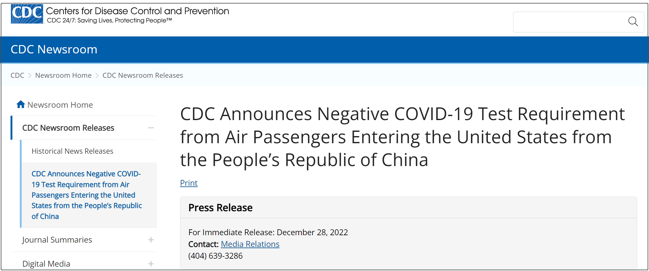 美CDC公告称,该措施将于从美国东部时间2023年1月5日凌晨12:01起施行,所有来自中国的两岁及以上的航空旅客都必须接受PCR检测(即“核酸检测”)或抗原自检等检测,检测时间应在离开中国大陆、香港或澳门前不超过2天的时间内,并在出发时向航空公司出示阴性检测结果。