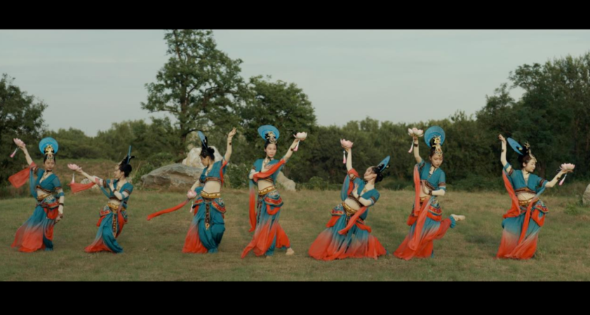 田晴老师说,她始终记得录制当天的画面,夕阳西下,同学们穿着飞天服饰,在草坪上摆出不同的飞天舞姿,金灿灿的阳光从他们身后俯射下来,形成一道道漂亮的剪影,似乎就像是一种远古的呼唤。她感叹:“我真觉得大家就像是石窟上的飞天一般,与我来了一场时空的对话。”
