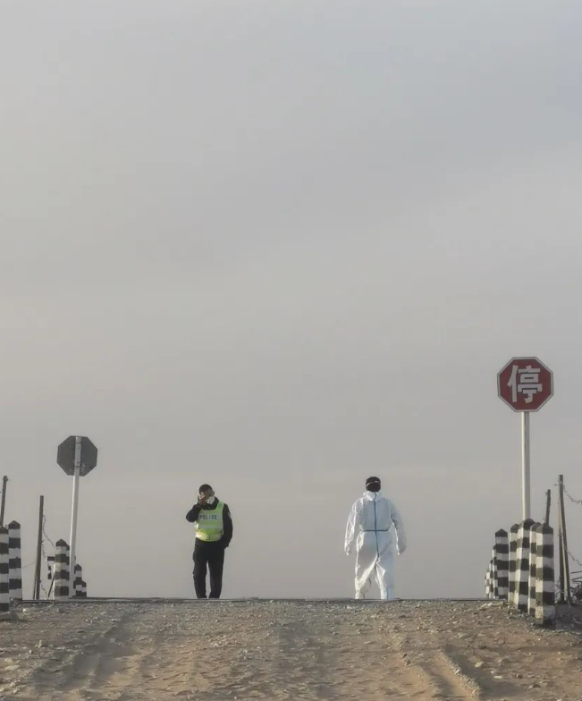 高速路分卡口的疫情防控执勤点,交警和医护人员在戈壁滩上查验疏导外来车辆,火车道的另一边,是茫茫戈壁,大风弥漫。“蓝”和“白”两种不同身份的人在同一条路上互为反方向行走,在标志牌“停”字处相遇的那一刻,仿佛我们正在经受的这一切都需要停止,可一切都在悄然的继续,大家都在路上,马不停蹄地往前走。疫情时代终将会过去,那些为这场灾难而付出的所有人,都会定格在历史的瞬间,消失在茫茫人海。