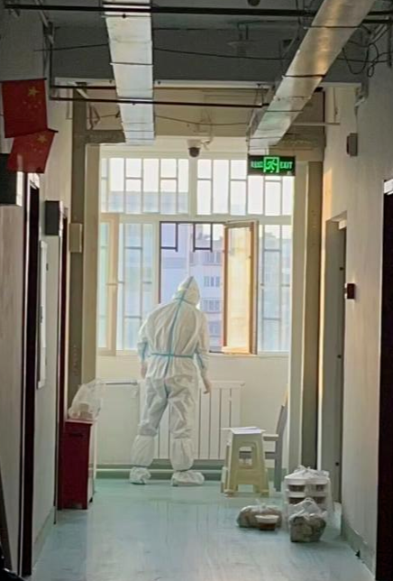 这张照片拍摄于宿舍楼道,当时学院处于静默状态,我们的晚餐需要通过升降机先升到6楼再由大白分发。夕阳的光很温柔,大白的身影很忙碌,二者的结合就像是“逆光英雄”。非常感谢大白的付出,如果当时没有他们辛勤付出,我们学院的疫情也不会快速好转!
